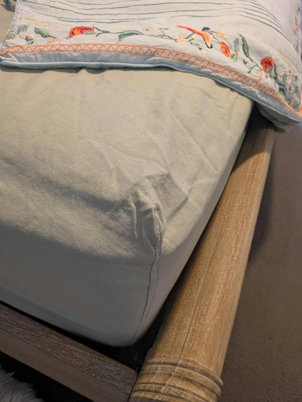 Really nice quality sheets. Love the texture, love the quality wide elastic. Great that it has the size printed on the elastic. The colours are beautiful together, the pretty blue and the beautiful latte shade goes beautiful against my timber bed.